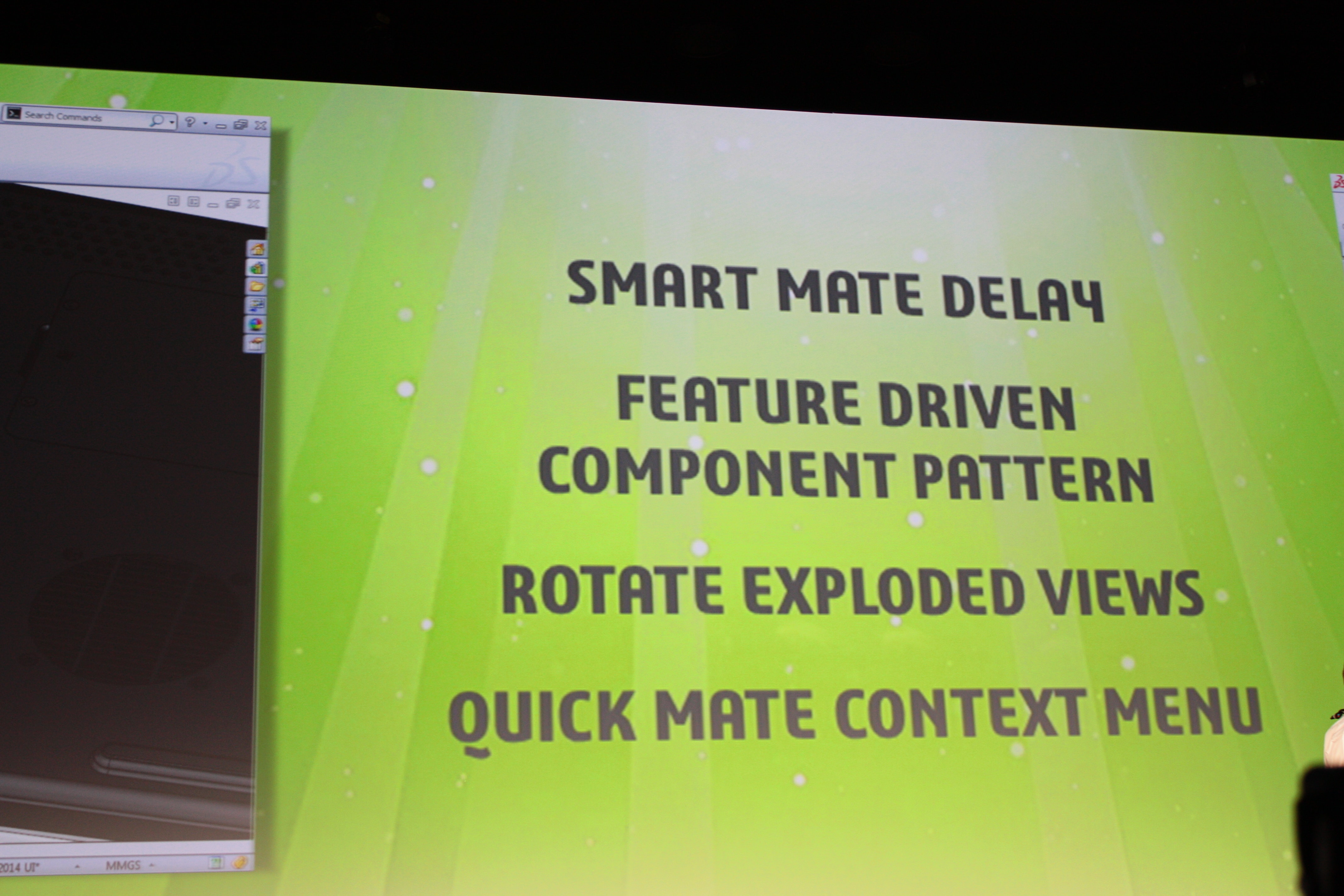 - Slot mate (announced in the SolidWorks 2014 sneak peek)