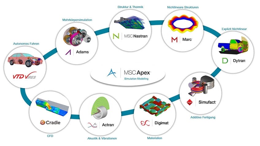 Die Erfolgsgeschichte von MSC reicht bis zu den Mondlandungen der NASA zurück. Seitdem hat sich das Softwareangebot ständig weiterentwickelt und verbreitert, seit über zehn Jahren liefert MSC branchenführende multiphysikalische CAE-Lösungen. Mit MSC CoSim gibt es nun eine komfortable Schnittstelle, die die Lösungen verbindet. Die Kopplung verschiedener Disziplinen führt zu einem einzigartigen, ganzheitlicheren Überblick. Alle MSC-Lösungen für Akustik, Mehrkörperdynamik, Strömungssimulation (CFD), Struktur- und Crashberechnung lassen sich mit Hilfe von CoSim kombinieren.