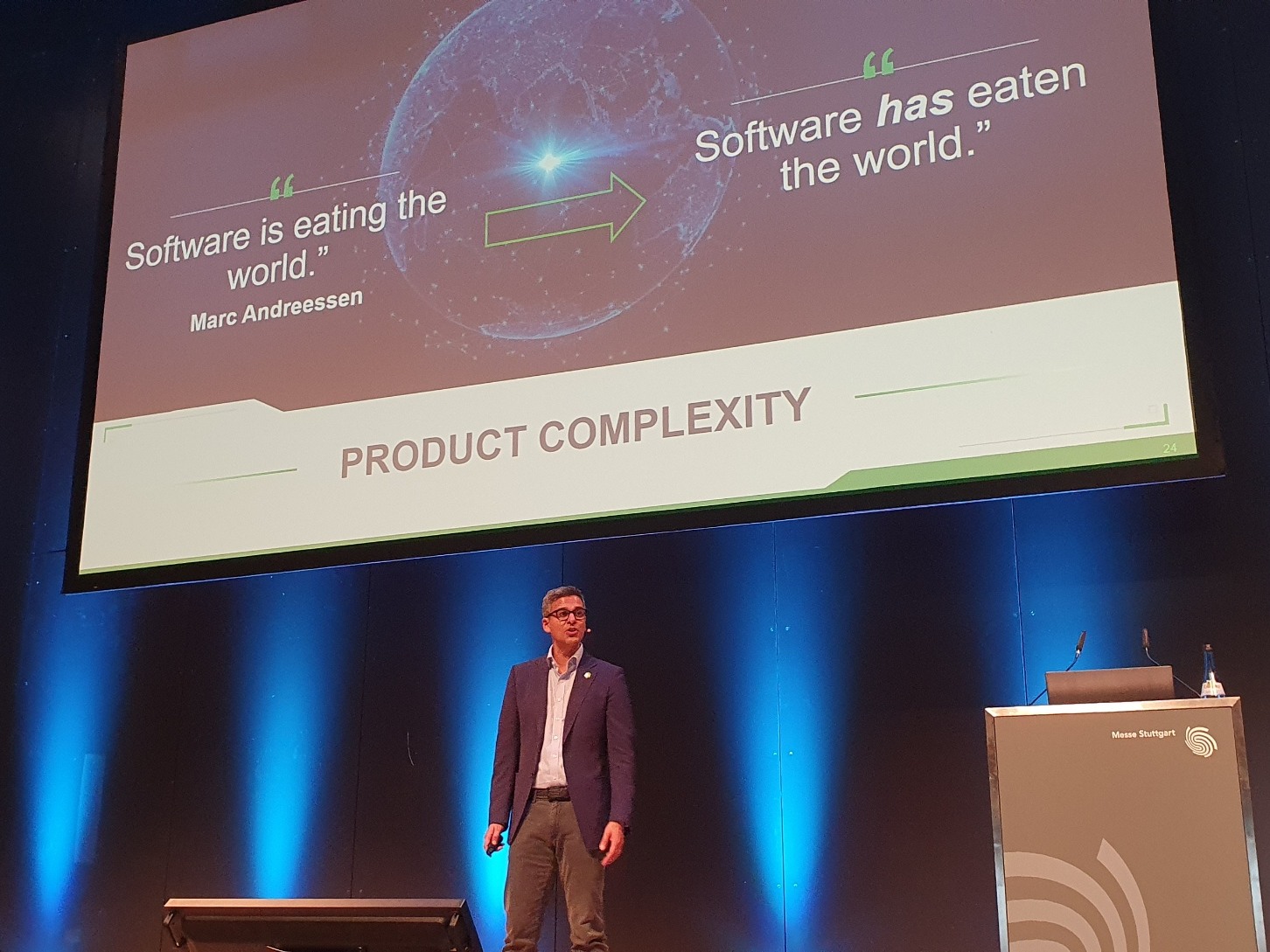 Einen seiner ersten Auftritte als CEO von PTC in Deutschland hatte Neil Barua auf der Fachkonferenz Digitalisierung. Er unterstrich, wie wichtig Software geworden ist: Das gesamte Apollo 11-Programm basierte auf 145.000 Zeilen Quellcode, ein aktuelles Auto benötigt 150 Millionen Codezeilen. Softwareentwicklung ist schneller als die von Hardware, Software bietet die Möglichkeit, seine Produkte einzigartig zu machen, Software bedeutet aber auch, dass sich ein Unternehmen neuen Konkurrenten gegenübersieht.